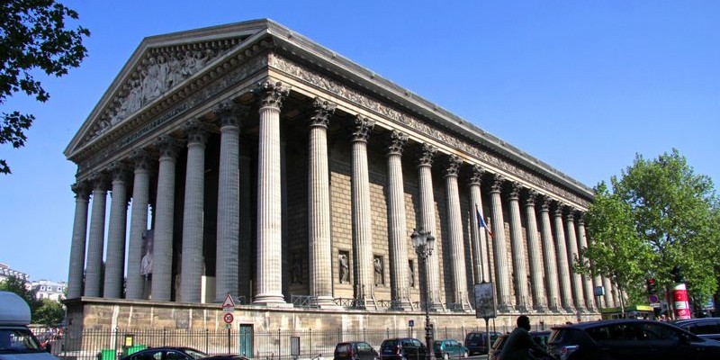 Búsqueda de la inspiración en la Antigüedad clásica (Grecia y Roma): formas simples, armonía de proporciones, uso de elementos arquitectónicos del mundo clásico (frontones, columnas, cúpula, arco de medio punto, etc.)